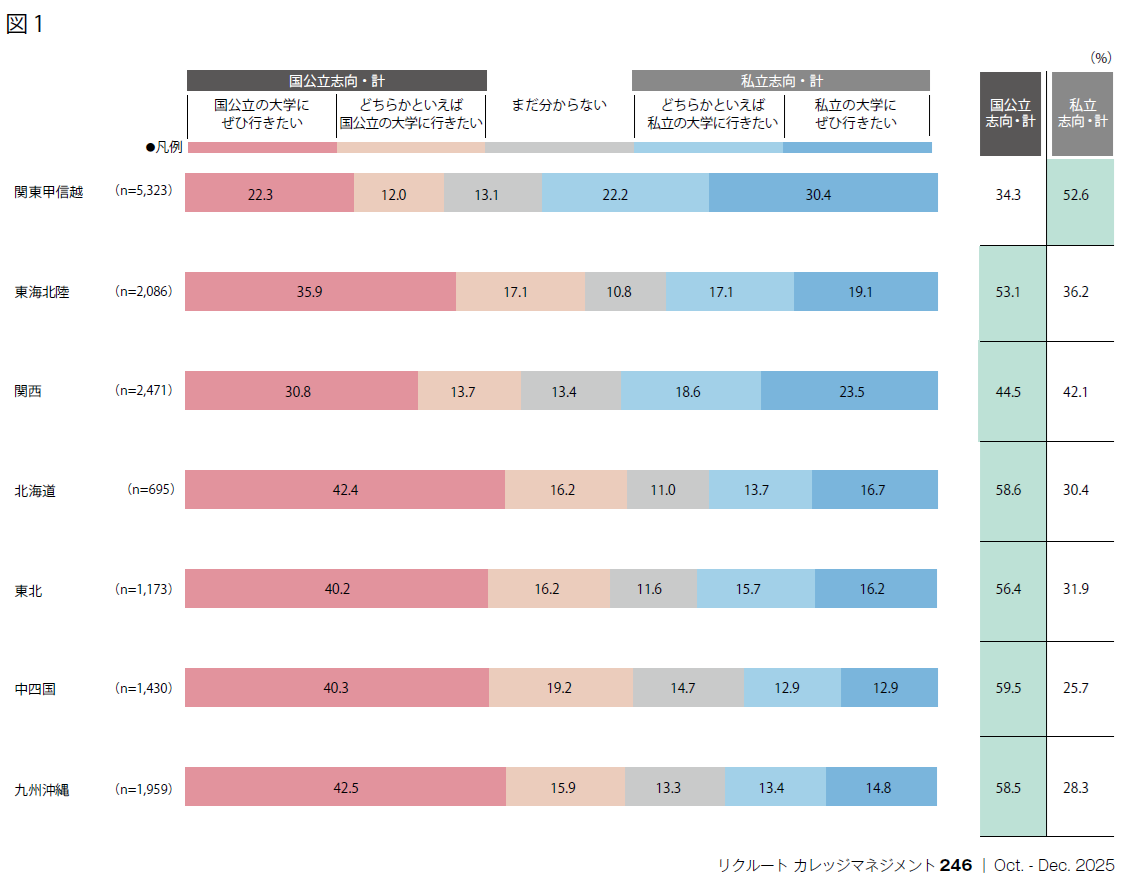 国公私立大学の進学意向について、全国を7エリアに分けた表が図1である。各エリアを比較すると、関東甲信越のみ私立志向(52.6%)が国公立志向(34.3%)を上回っており、かつその差分も18.3ポイントと非常に大きい。大規模私立大学の校数も多く、選択肢が豊富であることも後押ししている背景だろう。次に私立大学の数が多い関西だが、昨年は私立志向が高かったが、今年は国公立志向(44.5%)が私立志向(42.1%)を僅かに上回った。対照的にその他の5エリアでは全て国公立志向が私立志向を大幅に上回り、その差は16.9ポイント(東海北陸)から33.8ポイント(中四国)と非常に大きな広がりが見られた。
