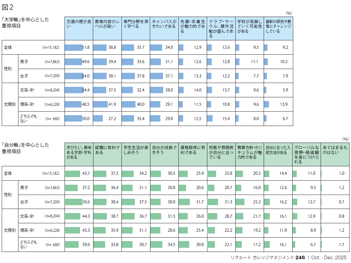 「大学軸」は「交通の便が良い(51.8%)」「教育内容のレベルが高い(38.8%)」「専門分野を深く学べる(35.7%)」「キャンパスがきれいである(34.0%)」等のポイントが高いのに対し、「自分軸」は「学びたい、興味ある学部・学科がある(43.7%)」「就職に有利である(37.3%)」「学生生活が楽しめそう(34.2%)」等が高い。「学びたい、興味ある学部・学科がある」は文系理系のどちらからも求められているが、とりわけ文理間で差があるものに注目すると、文系層からは交通の便とキャンパスのきれいさが求められており、理系層からは教育内容のレベルの高さと専門分野を深く学べることが求められていることが分かる。