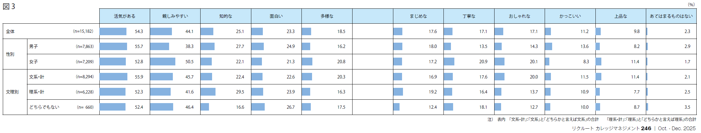 進学したい大学のイメージを全10 項目から選択した結果が図3である。上位から順に「活気がある(54.3%)」「親しみやすい(44.1%)」「知的な(25.1%)」と続く。特に文系層で活気、親しみやすさ、理系層で知的なイメージの大学への支持が高い。一方で、「上品な(9.8%)」や「かっこいい(11.2%)」イメージはそこまで強く求められてはいないことが見てとれる。