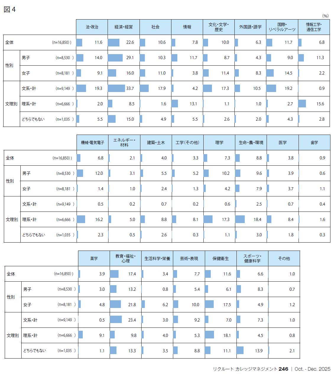 進学したい学問分野についての結果が図4である。人気が高いのは、経済・経営(22.6%)、教育・福祉・心理(17.4%)、国際・リベラルアーツ(11.7%)等。特に経済・経営は男子(29.1%)と文系(33.7%)からの支持が非常に厚く、教育・福祉・心理、国際・リベラルアーツは共に女子と文系から人気を得ている。さらに社会は全体の支持も比較的高く(10.6%)、かつ男女差が少ないことが特徴。また、値はそこまで大きくないが、生命・農・環境(8.8%)や医学(3.8%)、エネルギー・材料(2.1%)も男女差が少ない。文理融合を掲げる学部も増えてきている情報(7.8%)だが、男子(11.7%)>女子(3.8%)、理系(13.1%)>文系(4.2%)とそれぞれに開きが見られ、男女・文理とも揃って人気が高いとまでは言えない。