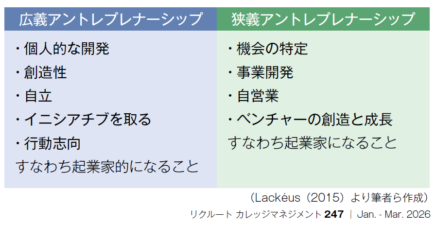 また、広義と狭義のアントレプレナーシップの混同も散見される。Lackéus(2015)(※2)では、アントレプレナーシップを広義と狭義に分けて議論することが提案されている。