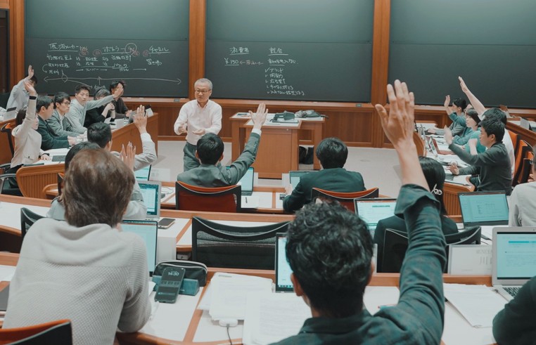 写真1 ビジネススクール(本科)の授業風景(写真は名古屋校)。「手が上がるのは教員が学生自身の思索を引き出す質問をしている証と考えます」(栗本氏)。