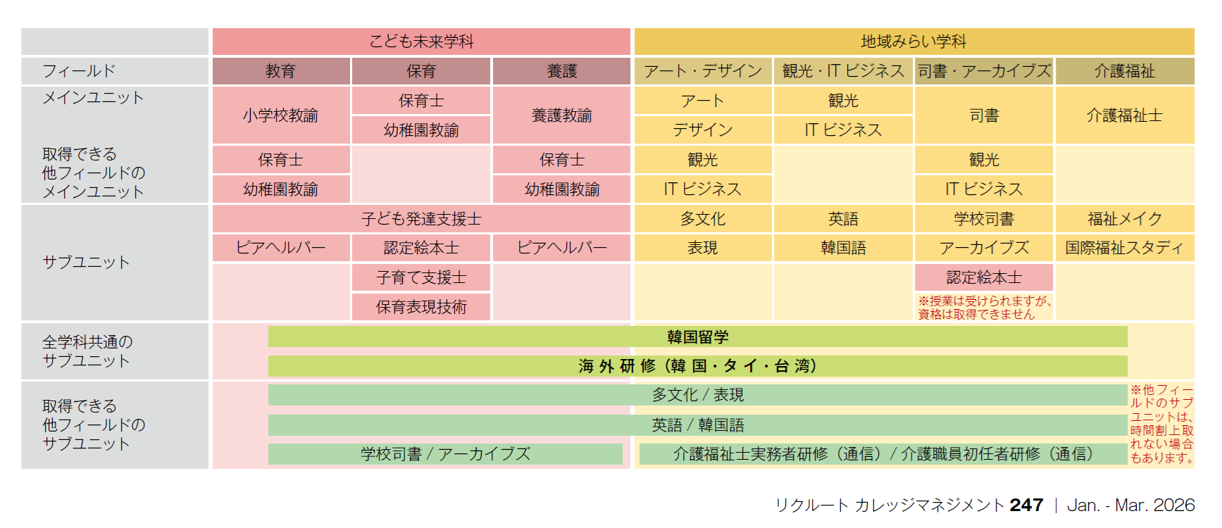 奏功したポイントは4つあったと今村学長は言う。1つ目は、養成課程をはじめ日本人学生の募集を向上させる地道な施策。昨年度は、今村学長自ら、200校ほどの高校に1人で訪問したという。2つ目は、24年度から地域みらい学科で、25年度には全学で、校名を変えないまま、男子学生の受け入れを始めたこと。3つ目は留学生の拡大。介護福祉分野に加えて、地元で人材ニーズが高まる観光分野の留学生確保に乗り出した。4つ目のポイントは「留学のサジョタン」だ。韓国語文化コースを中心に年間40名ほどが交換留学、共同学位、短期研修などで留学する、短大には珍しい留学の強さをアピールしてきた。26年度からはフィールド・ユニット制を導入し、全てのフィールド(学科内の「コース」に相当)の学生が「韓国留学」や「海外研修(韓国・タイ・台湾)」のユニット(「科目群」に相当)を履修できるようになる。韓国の4年制大学への編入学にもいっそう注力する。