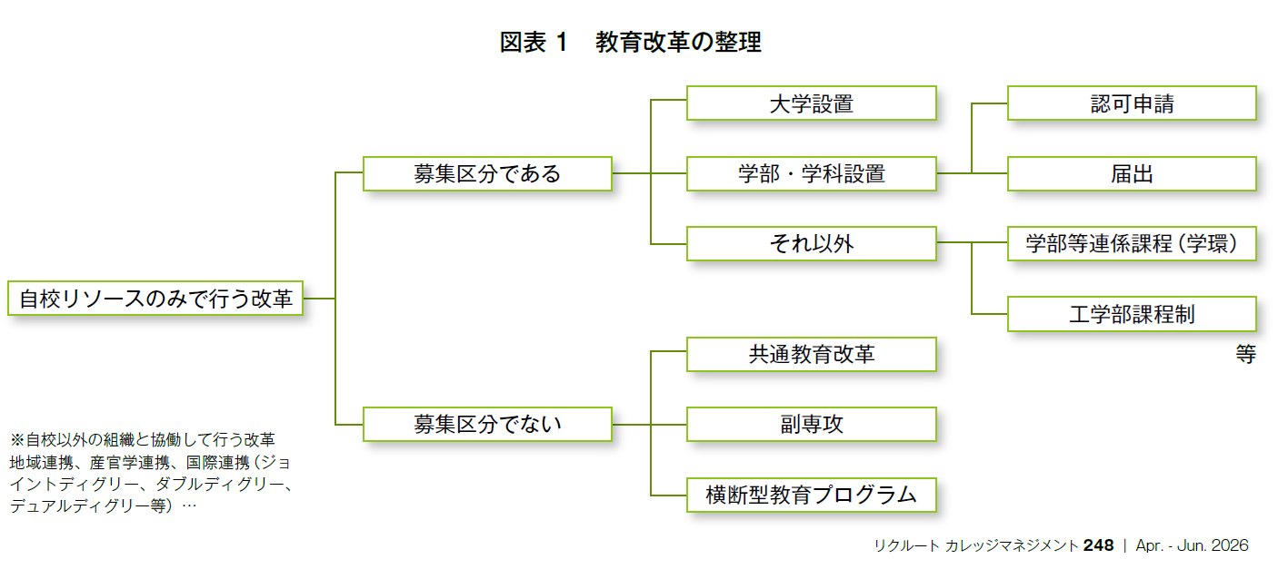 高等教育は各校が見据える社会のニーズに応じた教育を開発し、高校までの学習で育まれた資質・能力をシームレスに育て、社会で活躍できる人材を育成するべく奮闘している。しかし、通常3年程度は検討期間を要する学部・学科設置に対し、近年の産業動向や社会変化のスピード感が速く、検討段階と設置後完成年度に至る段階で人材ニーズが変容していることをどのように包含して設計するのか。国はスピーディーな改革を促す様々な施策を展開し、それらを活用して改革を行う例も増えているが、今回の調査ではそうした積極的な挑戦が、必ずしも奏功しているとは言えない実情も見えてきた。また、学部・学科設置に拘らず基礎教育や横断教育における改革、社会連携や高大連携等、教育改革のオプションが多様化(図表1)するにつれ、学部・学科のトレンドのみで見えることは限られてきている。改革でターゲットとする領域のスピード感やスキルセットとしての汎用性を鑑み、学部・学科設置ではなく共通教育で全学的改革を行うケースも増えてきた。こうした前提を整理したうえでデータを見ていきたい。