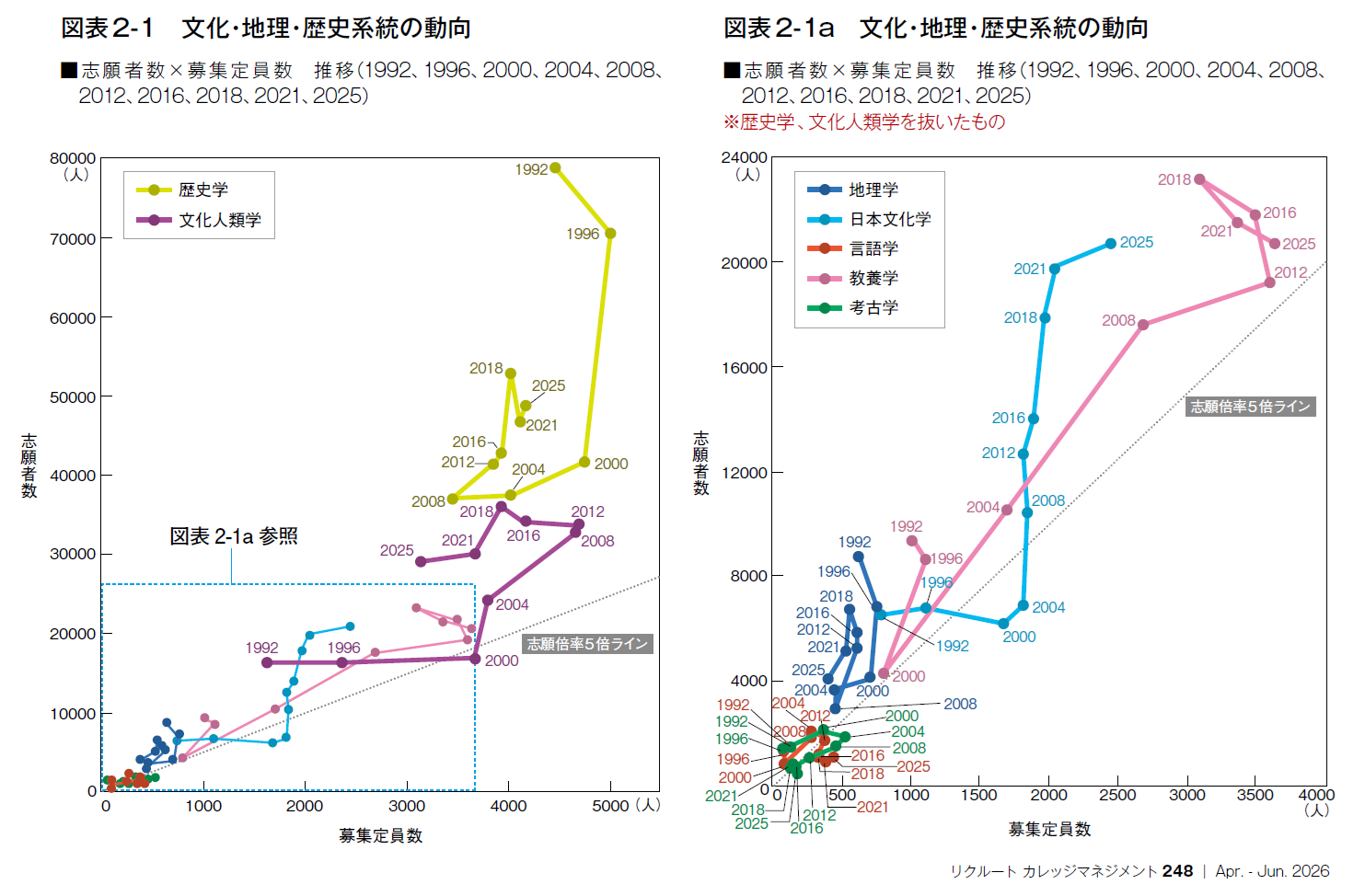ローカル人気:考古学、地球・宇宙学、保健衛生学 等 - リーマンショックによる不況等社会変化がトレンドに与える影響が大きく、学部・学科は長期トレンドと独自性の両輪で開発する必要がある