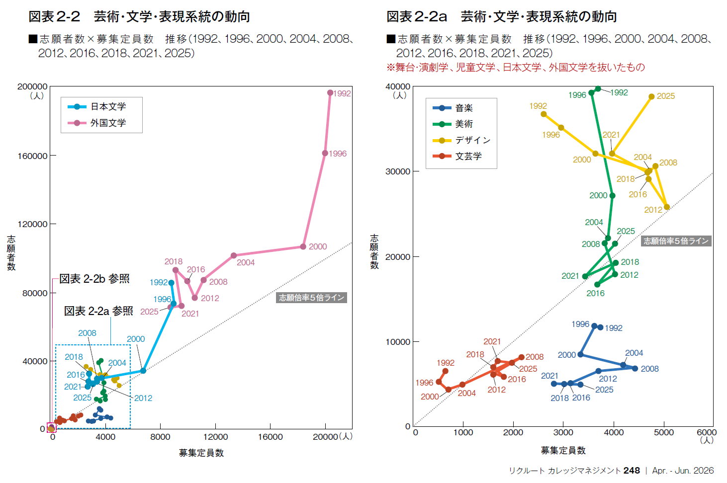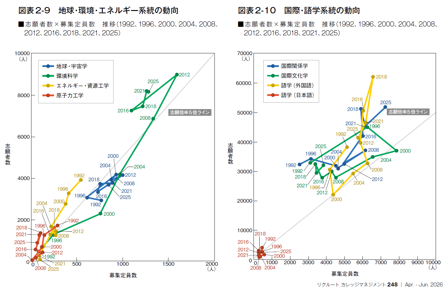 - ただしこうした分野は、学部・学科を新たに設置するよりも、既存の学部・学科をグローバルにしたりデジタルと組み合わせたりする動きのほうが盛んであり、系統で切り取った志願者トレンドだけで状況を考察することは年々困難に