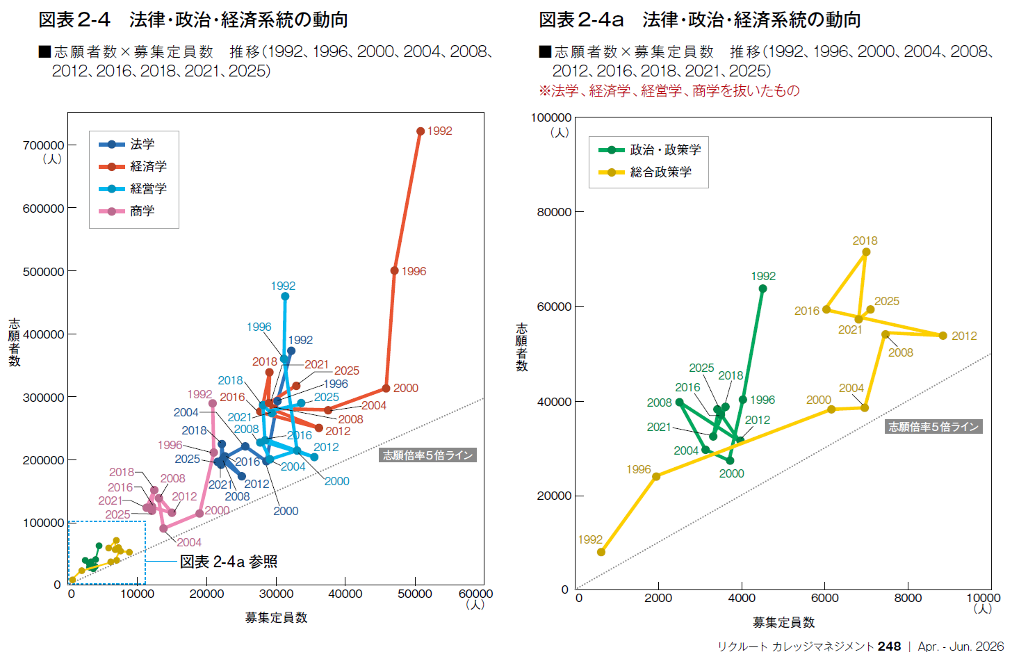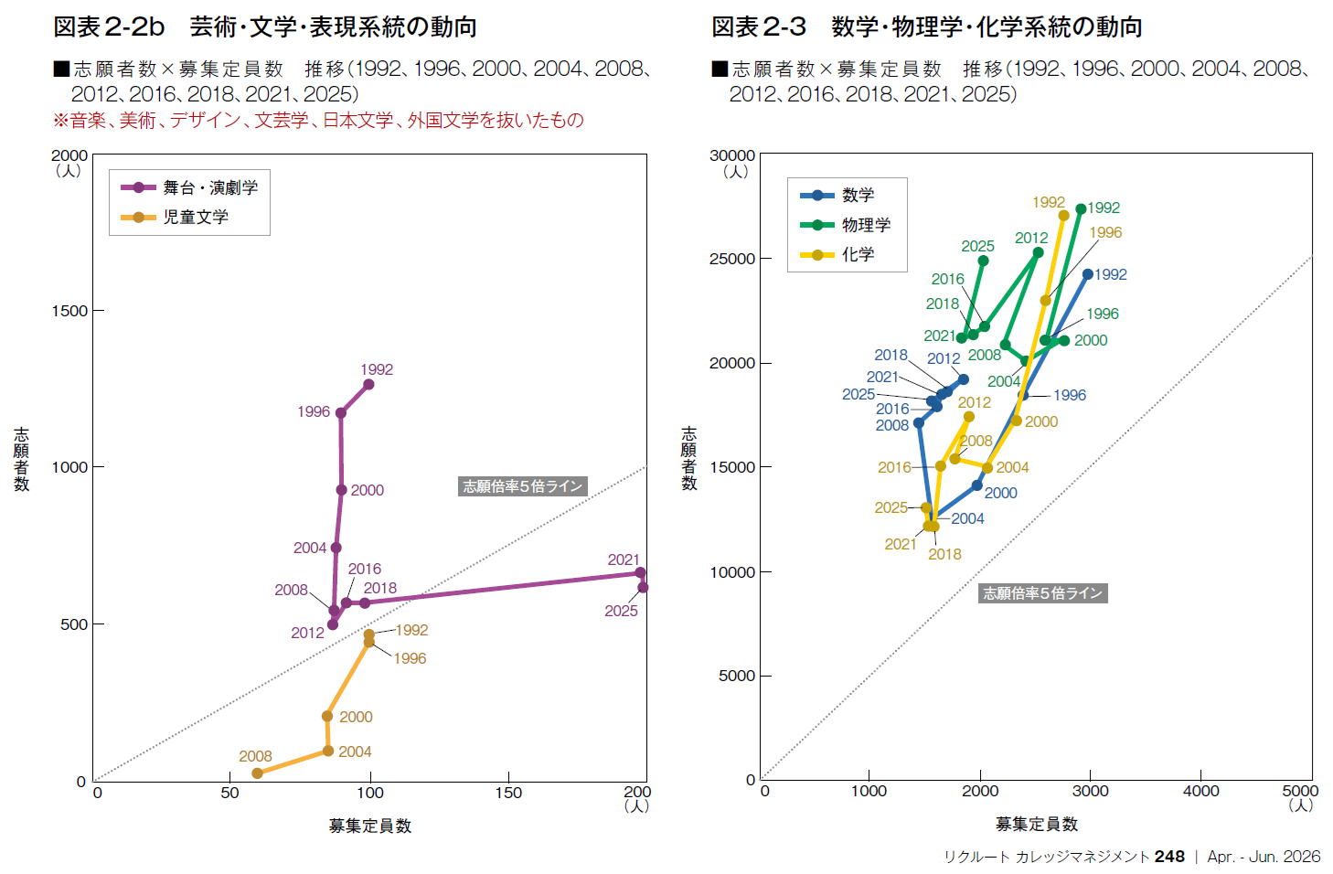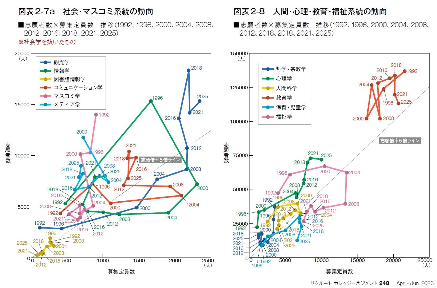 経済環境や雇用情勢あるいは政治動向等、社会の様々な要因が受験生の志望分野や進学観に作用し、学部・学科の「ライフサイクル」は大きく変化する。本誌では1992年以降その動きを把握し、定期的にマーケットトレンドを俯瞰してきた。本分析は「リクルート入試実態調査」の学科別集計データを基にしており、受験生の志願動向をもとに募集におけるトレンドを分析している。