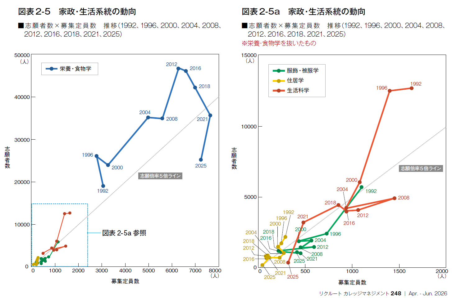 一方で苦しいのが家政・生活系(図表2-5)及び人間・心理・教育・福祉系(図表2-8)だ。家政・生活系は系統の募集定員が8695名→ 7978名(717名減少)、志願者が4万406名→2万6906名(1万3500名減少)と、単独マーケット自体が大きく縮小している。特に栄養・食物学と生活科学で減少幅が著しいが、これは人気低迷というほかに、家政系の設置の主である女子大の改革において、食農系や建築系への改組のリソースとなっているケースが多そうだ。
