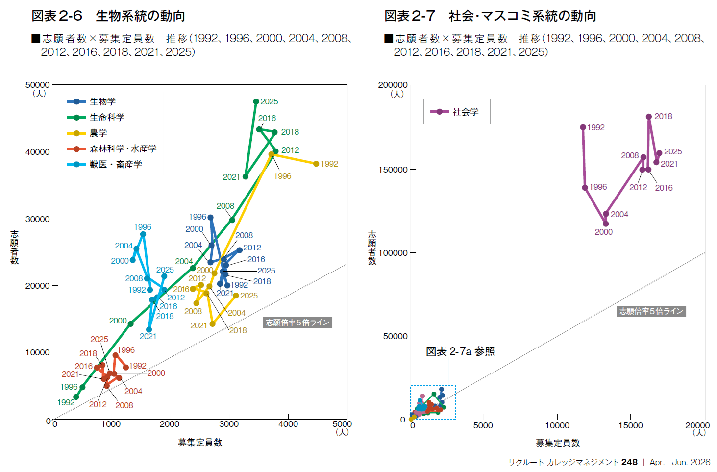 いわゆる理系系統についても見ておこう。理学系に当たる数学・物理学・化学系統(図表2-3)では物理学が募集定員・志願者ともに好調だ。生物系(図表2-6)は系統全体で、募集定員は1万1367名→1万2355名(988名増加)、志願者は9万6332名→12万4807名(2万8475名増加)と大きく拡大。全分野で数を増やしているが、特に志願者における生命科学が3万8718名→5万741名(1万2023名増加)、及び獣医・畜産学が1万4253名→2万3001名(8748名増加)とインパクトが大きい。