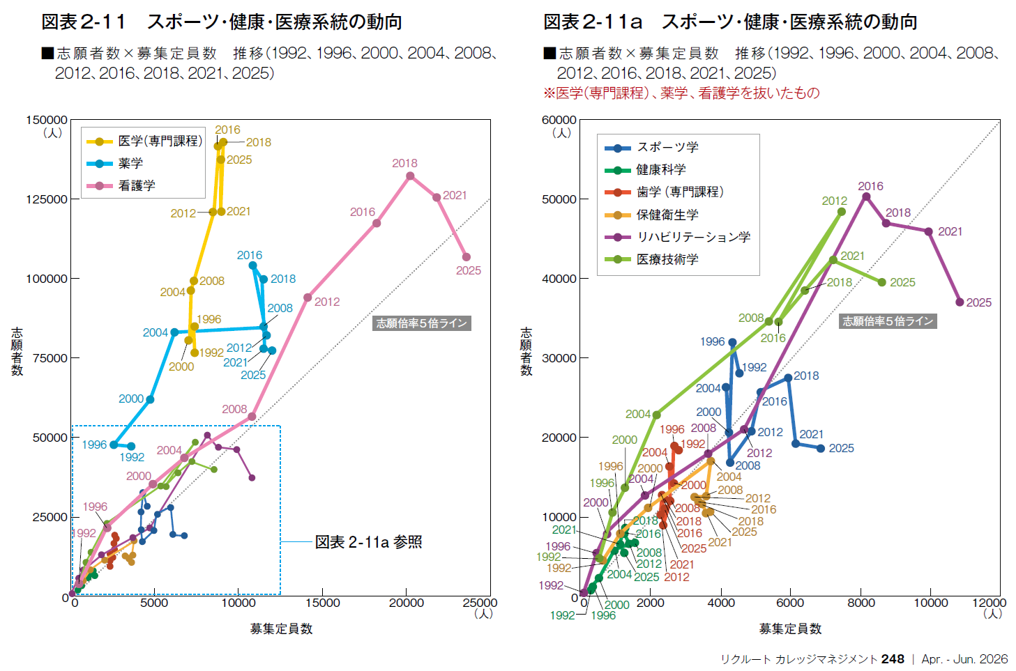 スポーツ・健康・医療系(図表2-11)を見ると、系統全体の募集定員は7万2753名→7万8165 名(5412名増加)と拡大したが、志願者は45万9189名→44万4812名(1万4377名減少)と規模が縮小した。定員増や新規設置等の大学側の動きほどは、志願者が動かなかった形だ。特にギャップが大きかったのは看護学、リハビリテーション学、医療技術学といったコメディカル領域。一方で志願者を大きく増やしたのは医学(専門課程)という結果になった。これは、不透明な時代にあって確実性を重視する傾向だけでなく、将来地域医療に従事しようとする志願者に向けた選抜枠である地域枠(都道府県奨学金貸与枠と連動しているものも多い)の存在が大きそうだ。文部科学省医学教育課資料「令和6年度大学医学部における地域枠等の導入状況」(令和6年12月)によると、2007年度には導入20大学・173名だった地域枠は、2024年度には導入71大学・1808名にも増加。医学部総定員の20%程度にまで拡大している。