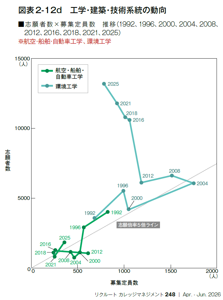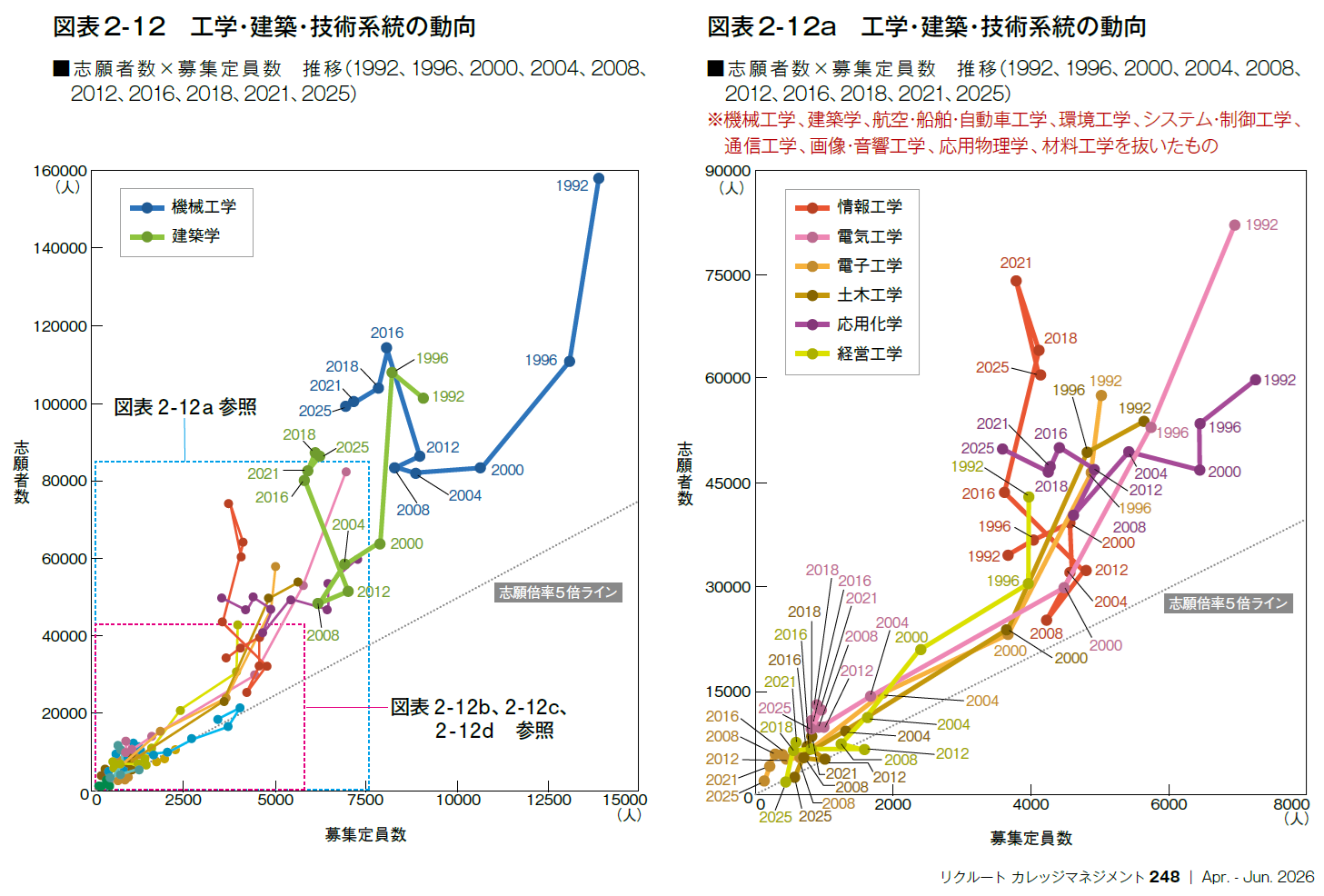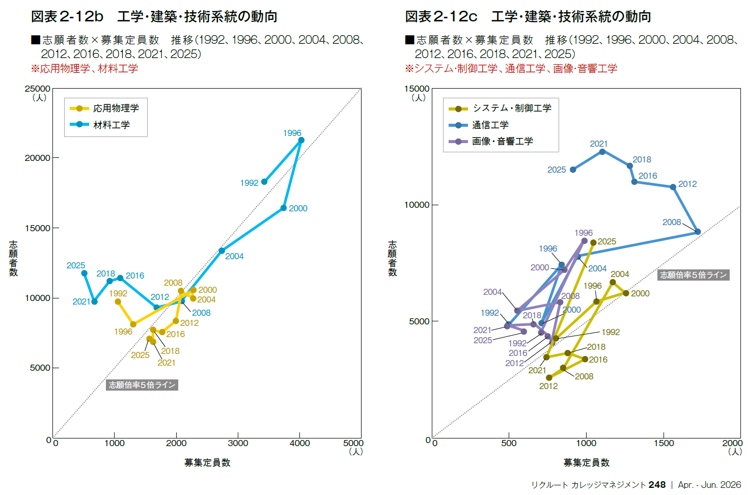 工学・建築・技術系(図表2-12)では、分野により状況が大きく異なっている。まず、2008年頃から増加トレンドにあった情報工学が、募集定員は3794名→4136名(342名増加)と増加しているものの、志願者は7万3919名→6万251名(1万3668名減少)と減少に転じた。ほか、募集定員・志願者ともに減少したのは、機械工学、通信工学、電気工学、電子工学、土木工学、経営工学である。