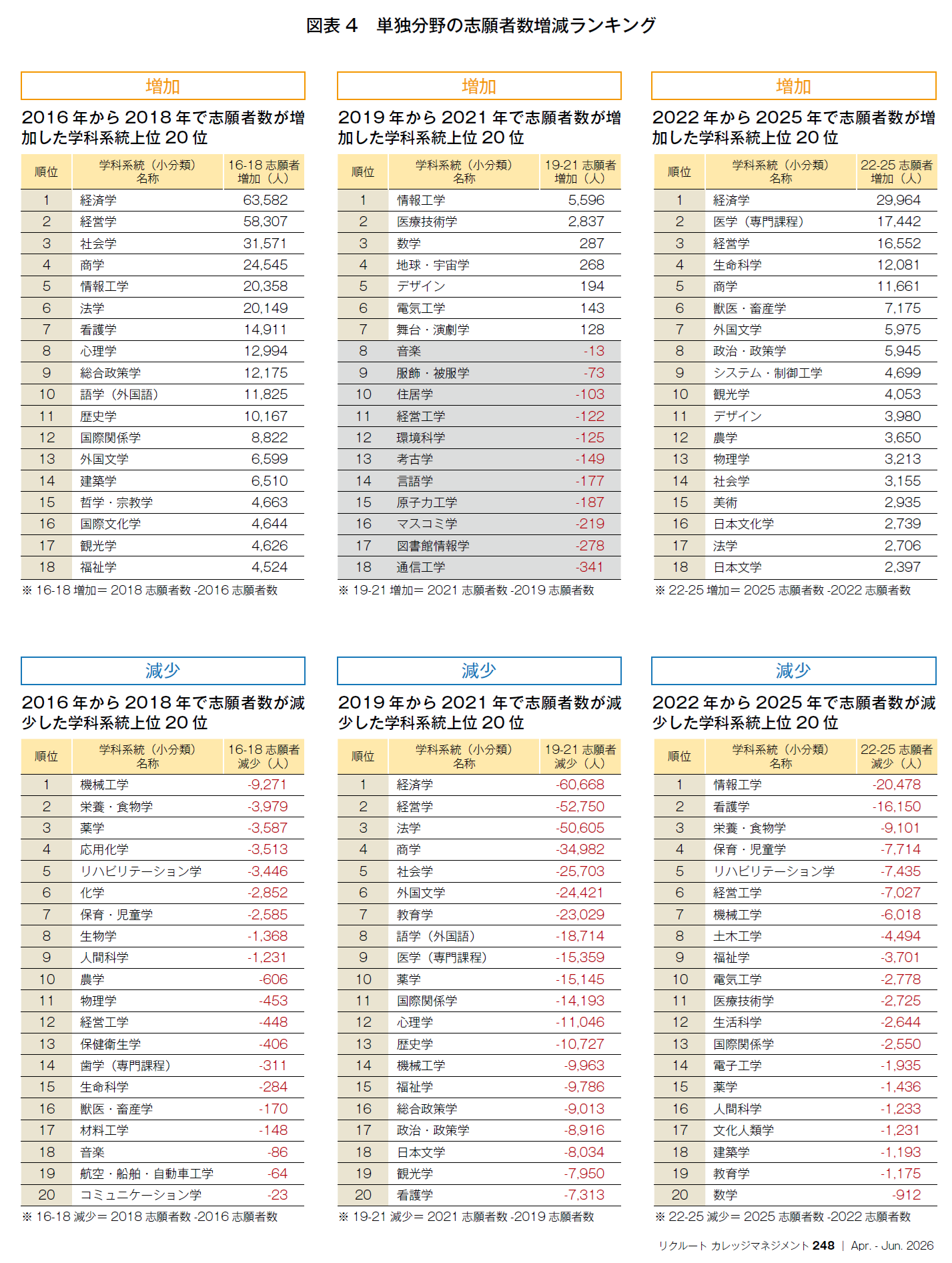 ここからは過去10年間(2016-2025年)に焦点を当ててデータを見ていきたい。学科ライフサイクルはその分野の募集力だけではなく、社会情勢を多分に反映する。単独分野の志願者増減について、3年ごとに区切ってランキングにしたのが図表4だ。今回調査対象の2022-2025年に加え、対比のため過去のデータ(2016-2018年、2019-2021年)を横に配置した。