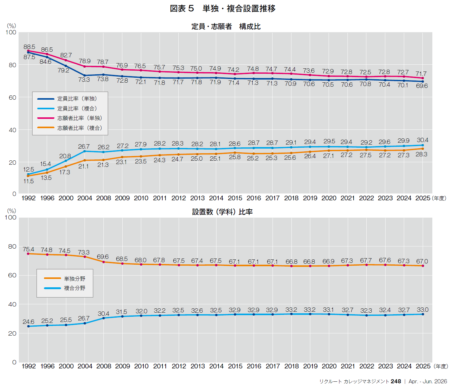 単独分野と複合分野の比率について、定員・志願者、及び学科数の推移を図表5に示した。どの観点でも、近年は概ね単独7対複合3で推移している。