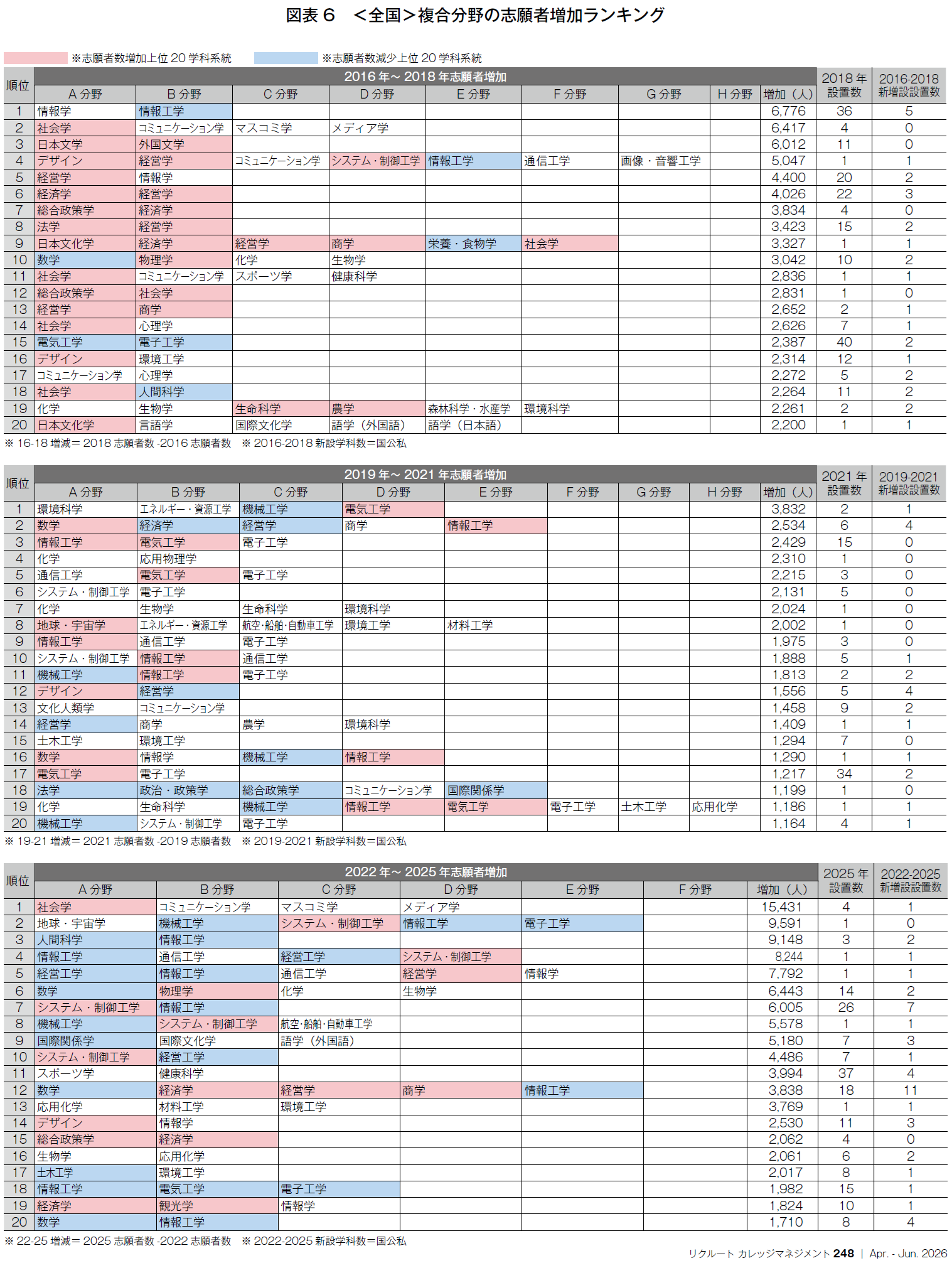 図表6で複合分野における志願者増加ランキングを確認したい。上位20位のうち、単独分野での志願者数が減少している分野を複合化したケースが13系統に及ぶ。単独分野で減少しているうち一定数は単独から複合への移行による減少と見てよさそうだ。