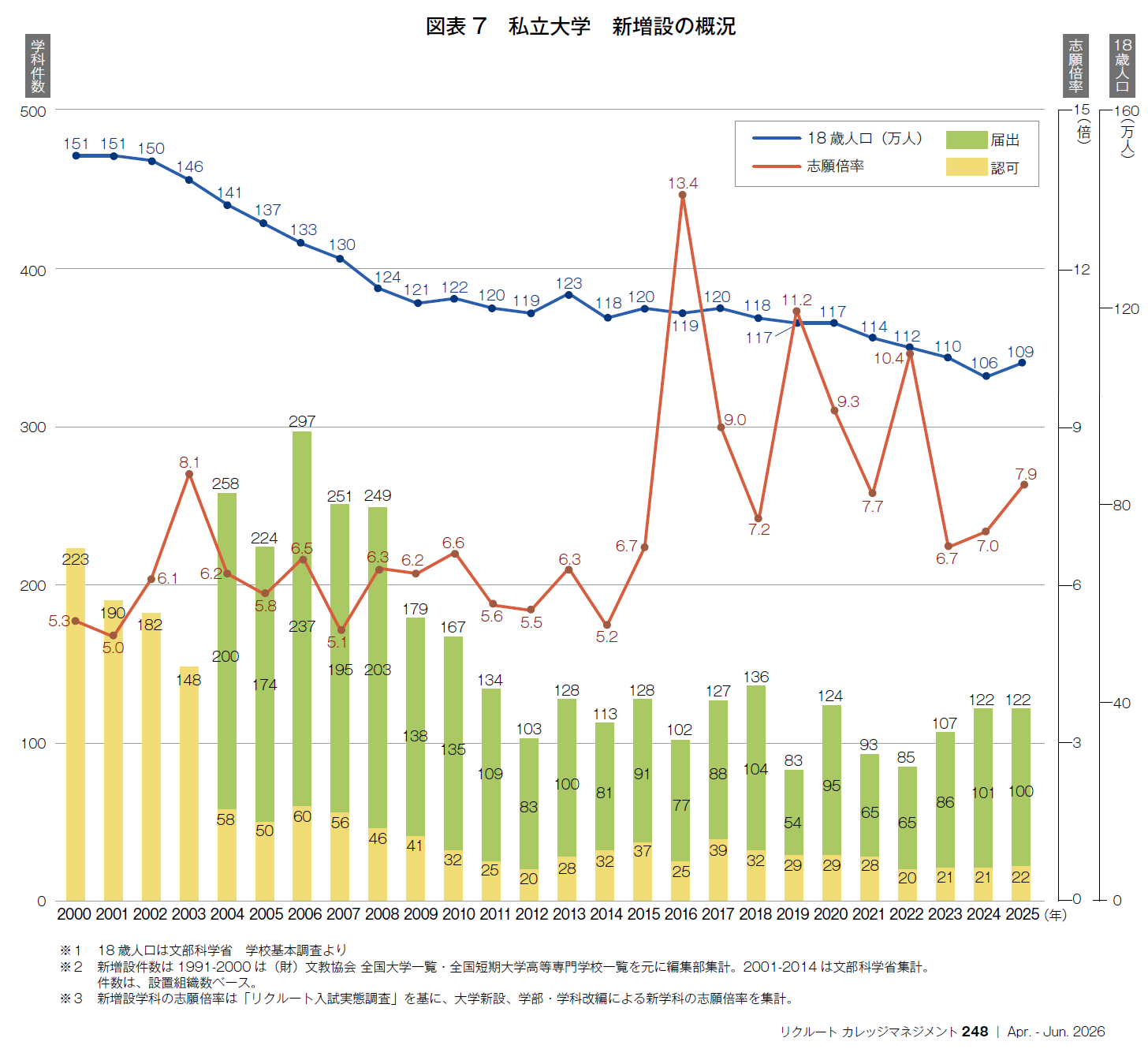 まず、私大の新増設設置状況を見ていこう。図表7は、2000年以降の認可・届出件数と志願倍率の推移を示している。周知の通り、2004年の届出制度導入以降、全体の8割を届出が占める状況が続く。設置件数で見ると2019~2022年頃のコロナ禍と重なった抑制期を経て、2023年頃からは増加傾向にある。