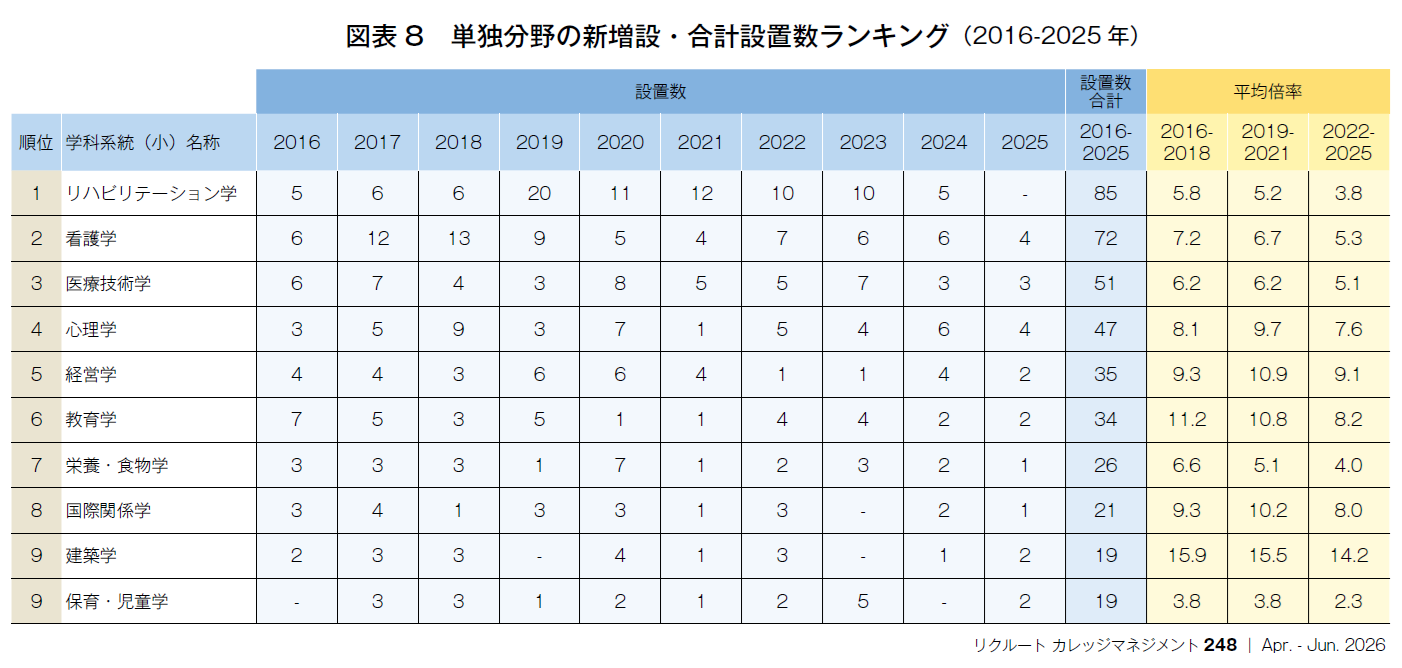 次に、人気のある分野を見ておきたい。図表8・9は、単独分野・複合分野それぞれにおいて、新増設の累計設置数(2016-2025)をランキングにしたものである。単独分野では、前回分析同様、医療系が上位3位を占める。国家資格取得を軸にしている以上、ある意味複合しようがない領域でもある。しかし、2020年前後で急増したリハビリテーション学は、2025年は設置がなかった。看護学・医療技術学も減少傾向にある。