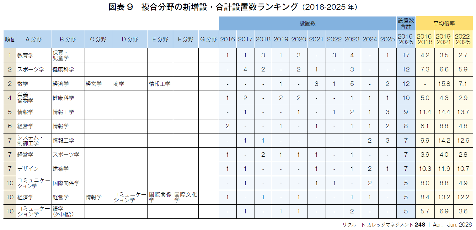 複合分野では、1位は教育学×保育・児童学、2位はスポーツ学×健康科学と、関連分野での複合型新増設が上位だ。同率2位の数学×経済学×経営学×商学×情報工学は、図表6でも述べた通り、データサイエンス系の学部・学科設置である。情報系は特に、データ特化型の人材を育成する以外に、どのような専門分野と組み合わせて学科としての特色を出すかという観点でも近年複合することが多いようだ。