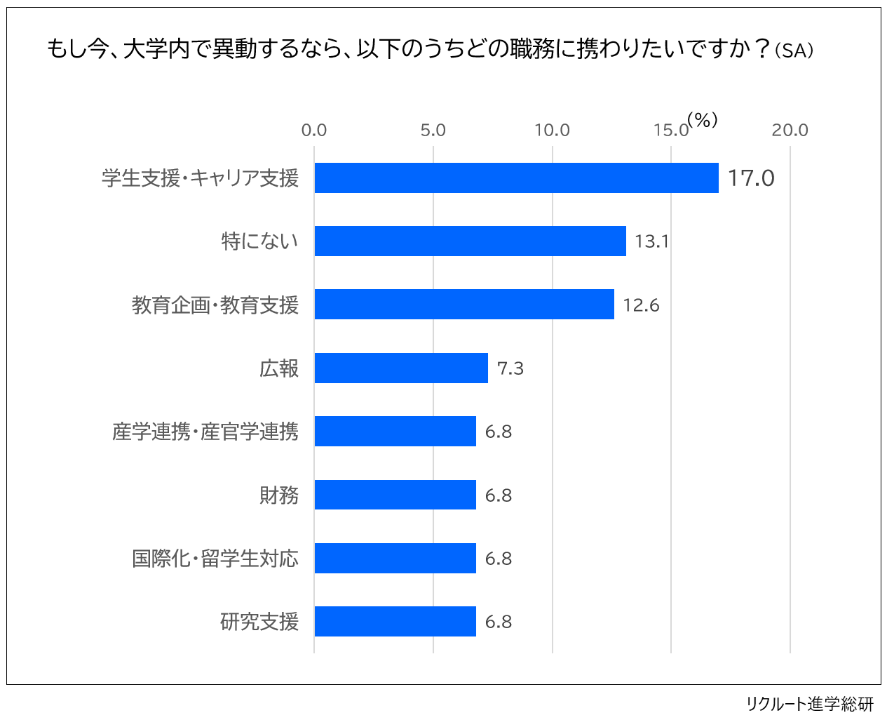 1位は「学生支援・キャリア支援」で17.0%。次に多かったのは「特にない」という回答。3位「教育企画・教育支援」4位「広報」と続き、5位は「産学連携・産官学連携」「財務」「国際化・留学生対応」「研究支援」が同率となりました。