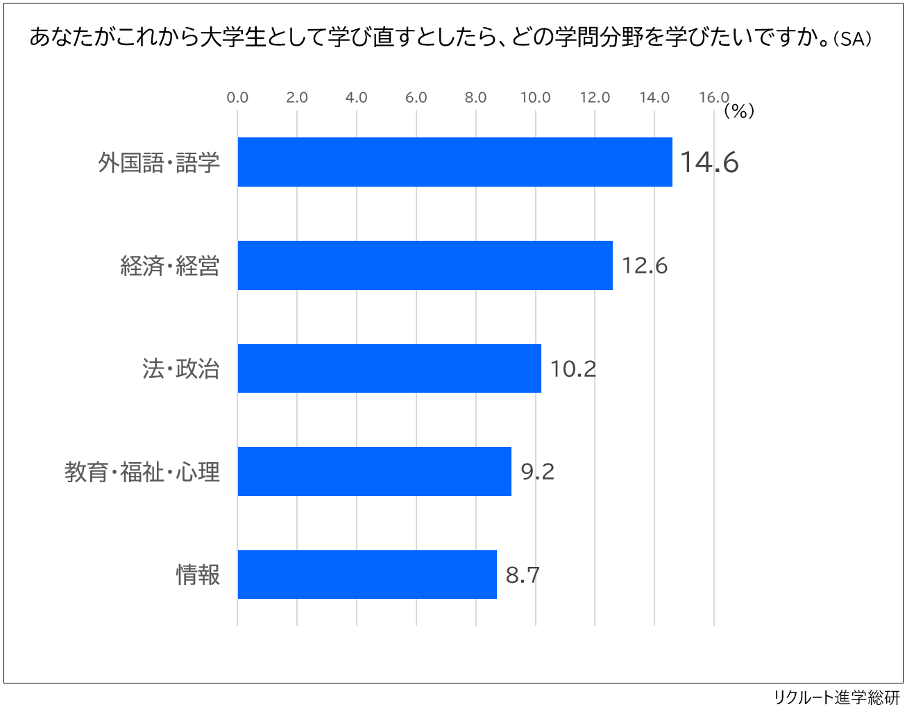 学び直したい学問の第1位は「外国語・語学」で14.6%、次いで2位は「経済・経営」の12.6%という結果でした。3位は「法・政治」、4位は「教育・福祉・心理」と続き、5位は「情報」という結果でした。